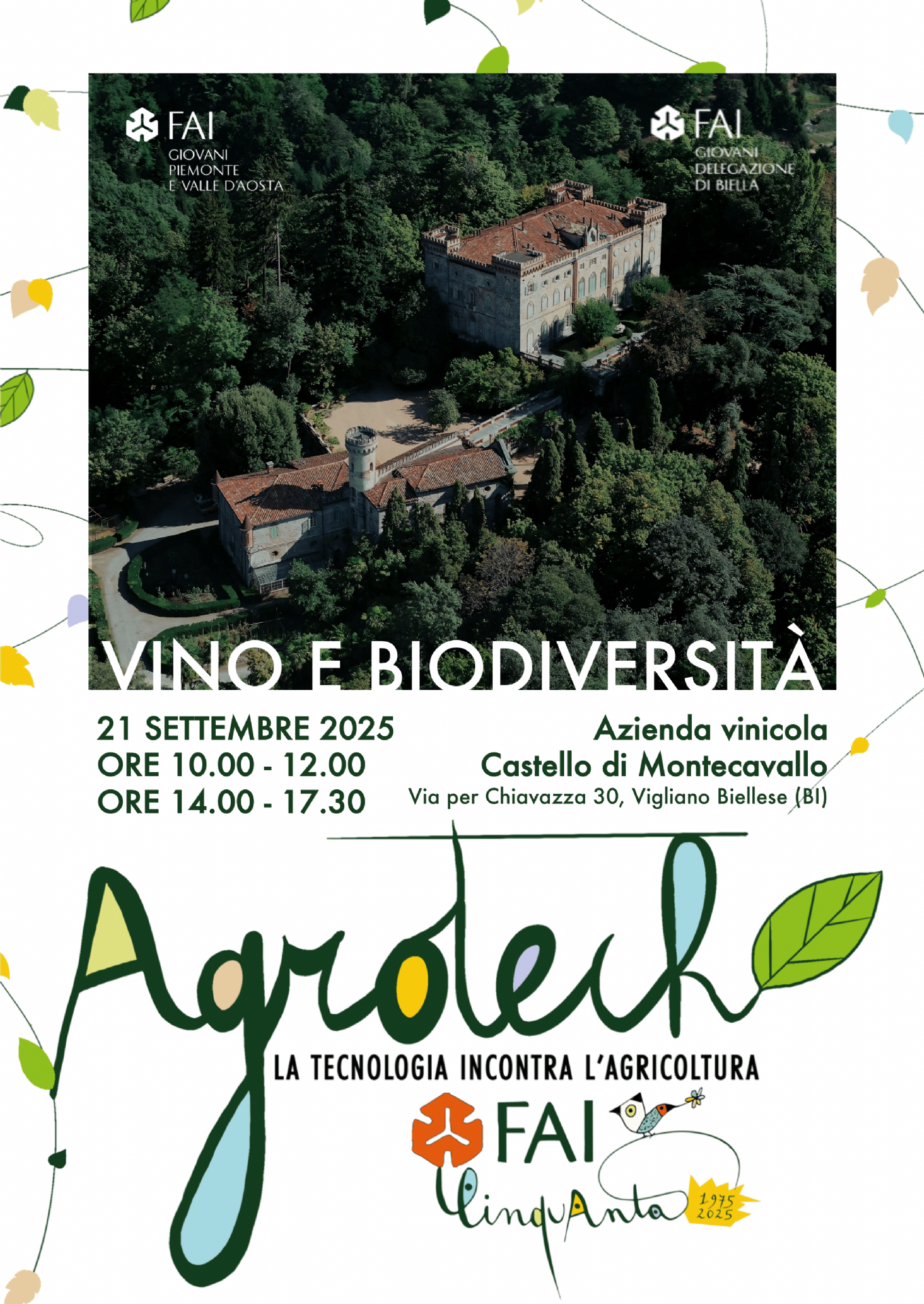 Domenica 21 settembre, il Gruppo FAI Giovani di Biella invita ad un nuovo appuntamento dell'evento regionale FAI Giovani Piemonte e Valle d'Aosta: Vino e Biodiversità presso l'Azienda vinicola del Castello di Montecavallo di Vigliano Biellese. Lungo il percorso sarà possibile visitare i vigneti della tenuta, per scoprire come la biodiversità influisca sulla qualità delle uve e sul carattere dei vini prodotti.