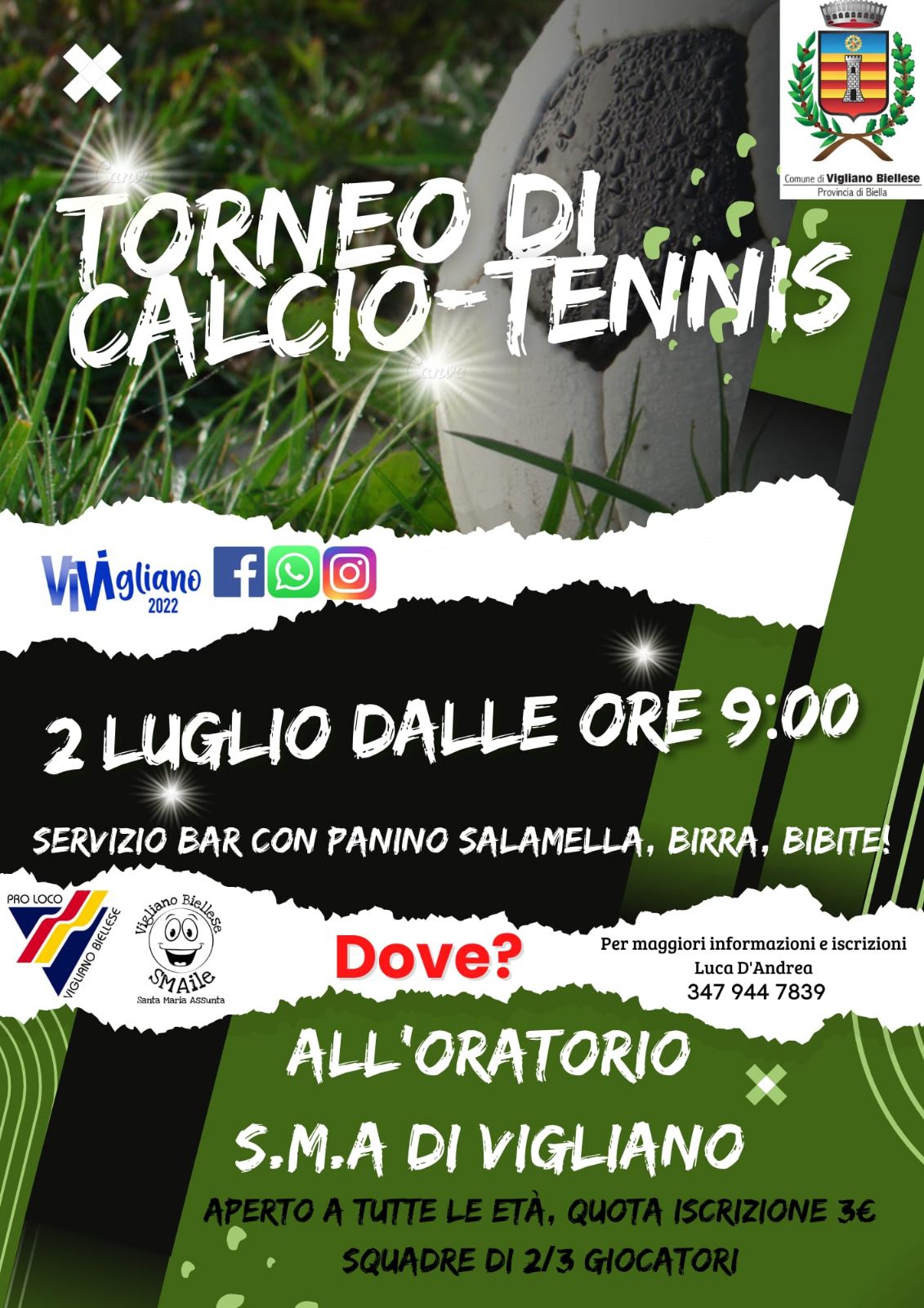 Sabato 2 luglio, a partire dalle ore 9.00, nell'ambito di ViVigliano 2022, presso l'Oratorio di Santa Maria Assunta, si terrà un torneo di calcio-tennis, aperto a tutte le età.
