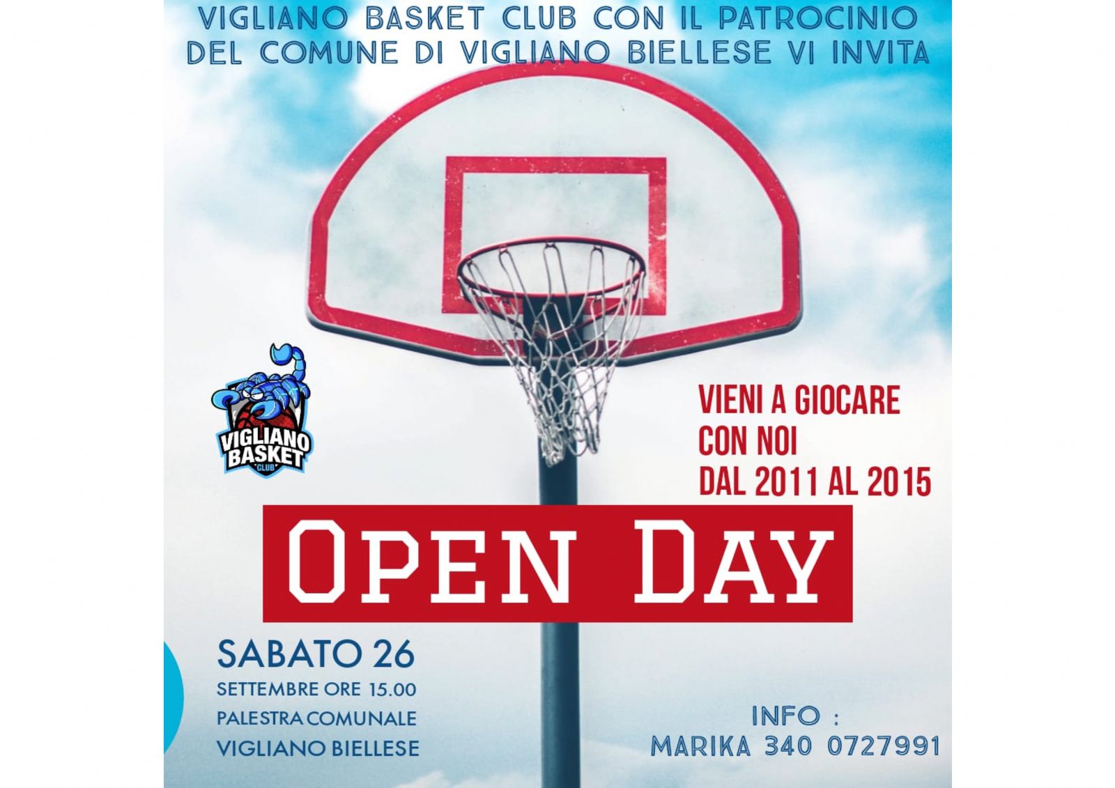 Sabato 26 settembre alle ore 15.00, la palestra comunale di Vigliano ospiterà il Vigliano Basket Club che, con il patrocinio del Comune di Vigliano, organizza un Open day per i ragazzi nati dall'anno 2011 al 2015.