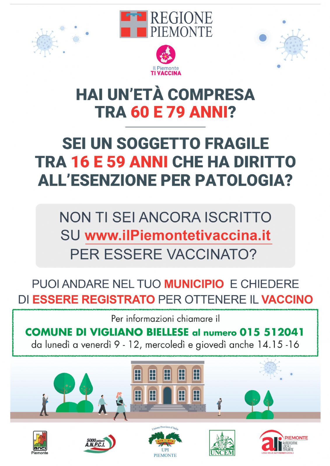 Se hai un'età compresa tra i 60 e i 79 anni e non ti sei ancora iscritto sul portale www.ilPiemontetivaccina.it, puoi rivolgerti telefonicamente al Comune, al numero 015 512041, e chiedere di essere registrato per ottenere il vaccino.