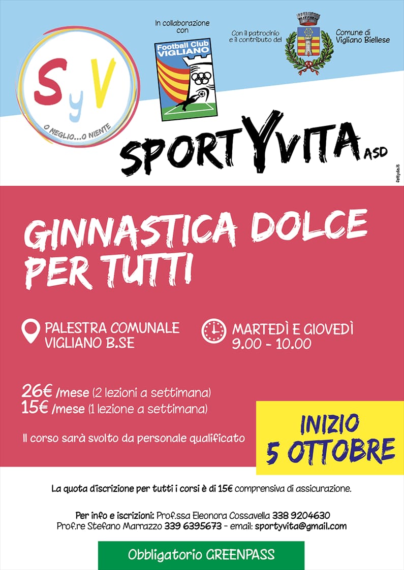 L'associazione SportYvita ASD, in collaborazione con l'ASD FC Vigliano e con il sostegno dell'Amministrazione comunale, organizza corsi di attività motoria presso la palestra comunale, nel pieno rispetto dei protocolli sanitari anticontagio Covid-19. Le lezioni si svolgeranno il martedì ed il giovedì, dalle 9.00 alle 10.00.