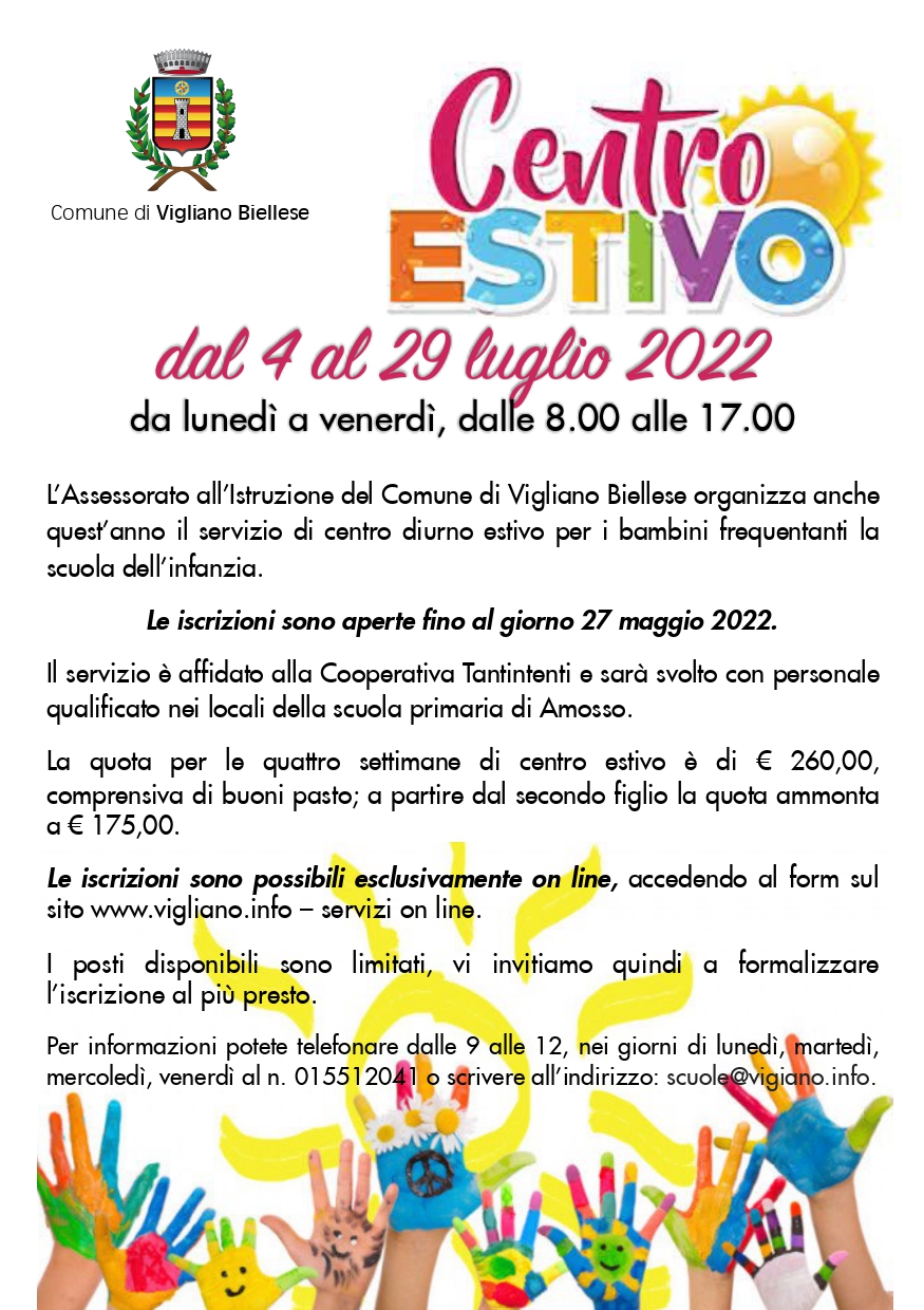 Sono aperte fino a venerdì 27 maggio le iscrizioni al centro estivo per la scuola dell'infanzia.
