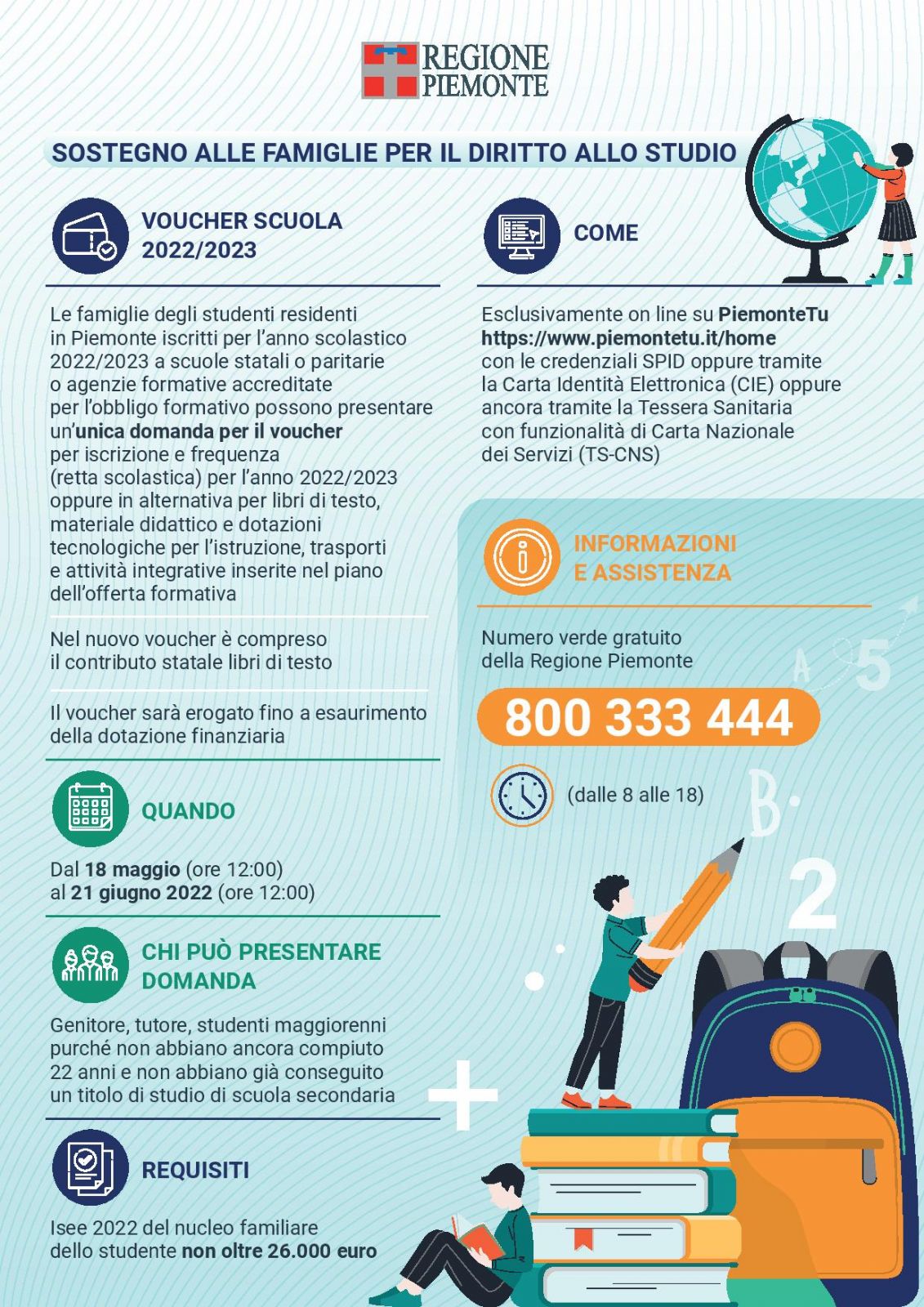 Per informazioni e assistenza è attivo il Numero Verde gratuito 800-333-444 (dal lunedì al venerdì dalle 8 alle 18), oppure ci si può rivolgere agli Uffici relazioni con il pubblico della Regione Piemonte o ancora consultare il sito internet della Regione, nella sezione Voucher scuola clicca qui per accedere direttamente alla pagina del sito della Regione Piemonte dedicato alla scuola