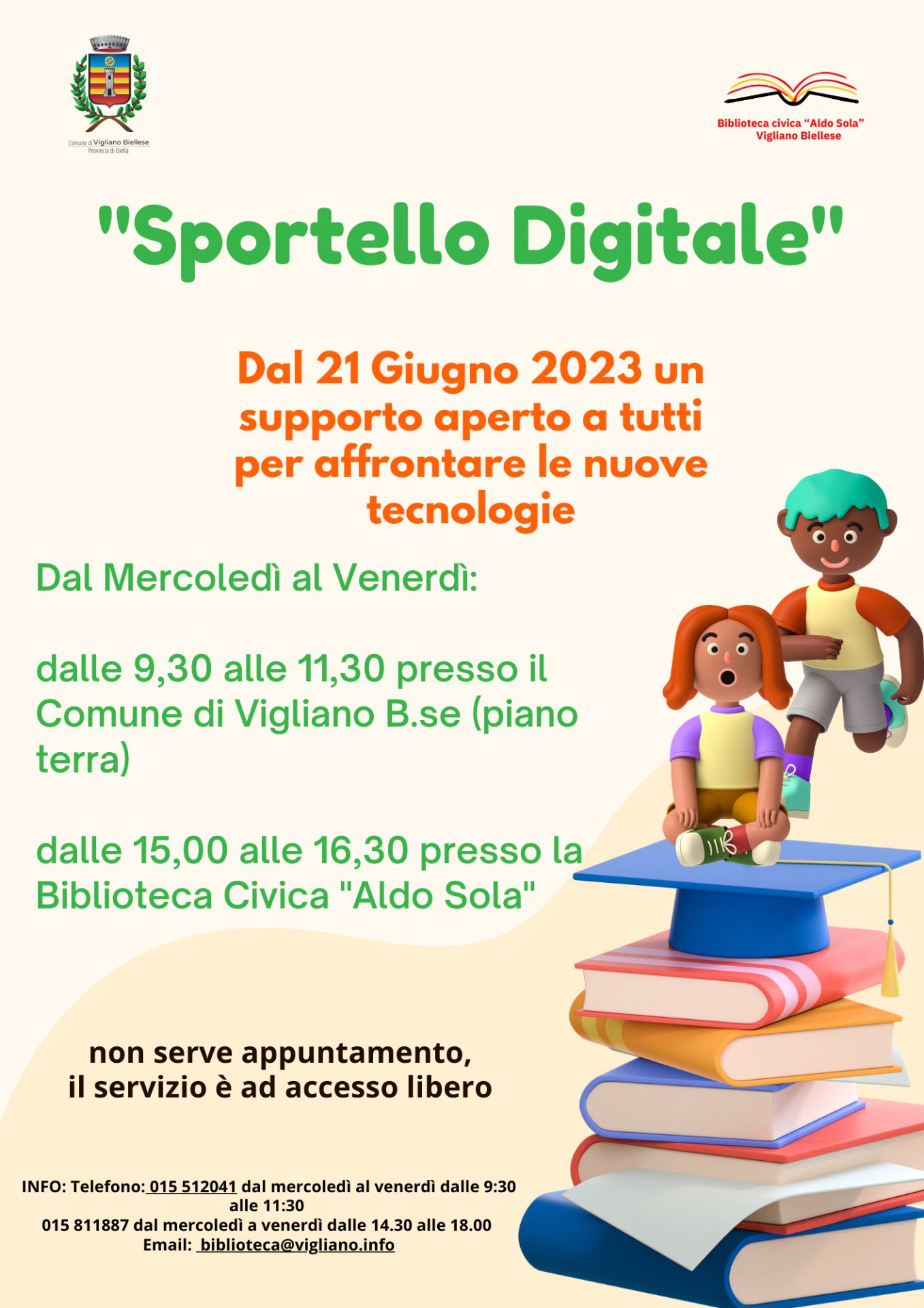 Dal 21 Giugno 2023, per tre giorni a settimana, apre a Vigliano Biellese uno sportello per aiutare le persone nell'utilizzo di supporti digitali come SPID e CIE. Una volontaria del Servizio Civile Nazionale Digitale, Camilla, si impegnerà a darvi il supporto di cui avete bisogno. Il progetto, infatti, è nato ed è stato pensato proprio per avvicinare al mondo digitale tutti coloro che non hanno familiarità con il web.
