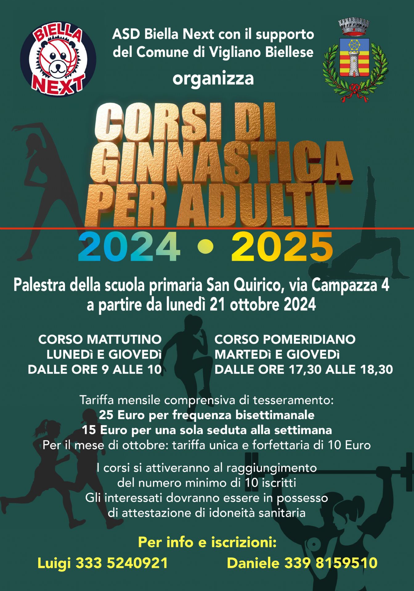 Fino a esaurimento posti, sono ancora aperte le iscrizioni ai corsi di ginnastica per adulti organizzati dall’associazione ASD Biella Next con il supporto del Comune di Vigliano Biellese, presso la palestra della scuola primaria di San Quirico, via Campazza 4.