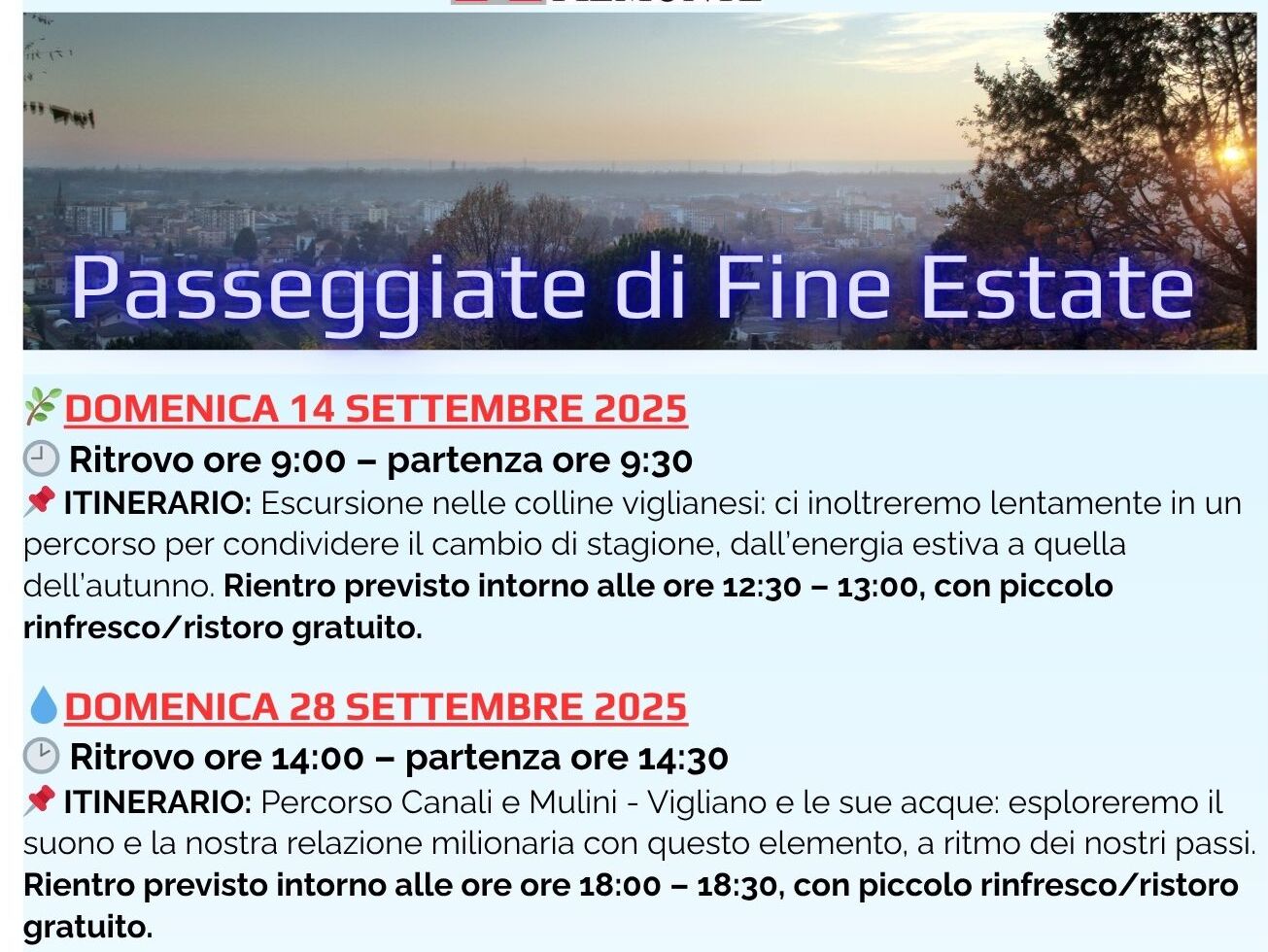 Il Comune di Vigliano Biellese propone due speciali appuntamenti all’aria aperta con le “Passeggiate di Fine Estate”, un’iniziativa pensata per offrire momenti di benessere, scoperta del territorio e socialità attiva.