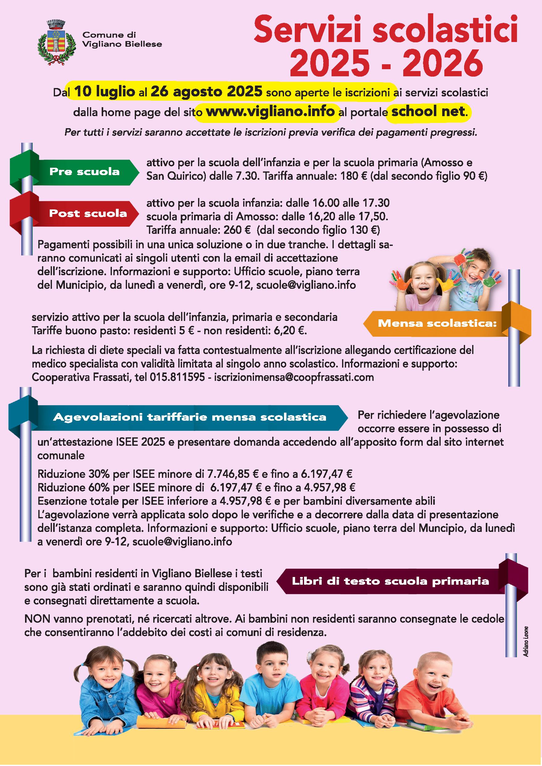Dal 10 luglio al 26 agosto 2025 sono aperte le iscrizioni solo on line ai servizi scolastici, che saranno accettate previa verifica dei pagamenti pregressi.