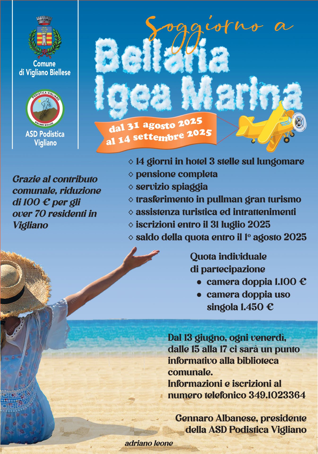 Aperte fino al 31 luglio le adesioni al soggiorno marino organizzato dall’Associazione sportiva Podistica Vigliano, con il supporto del Comune, dedicato in particolare alla popolazione anziana.
