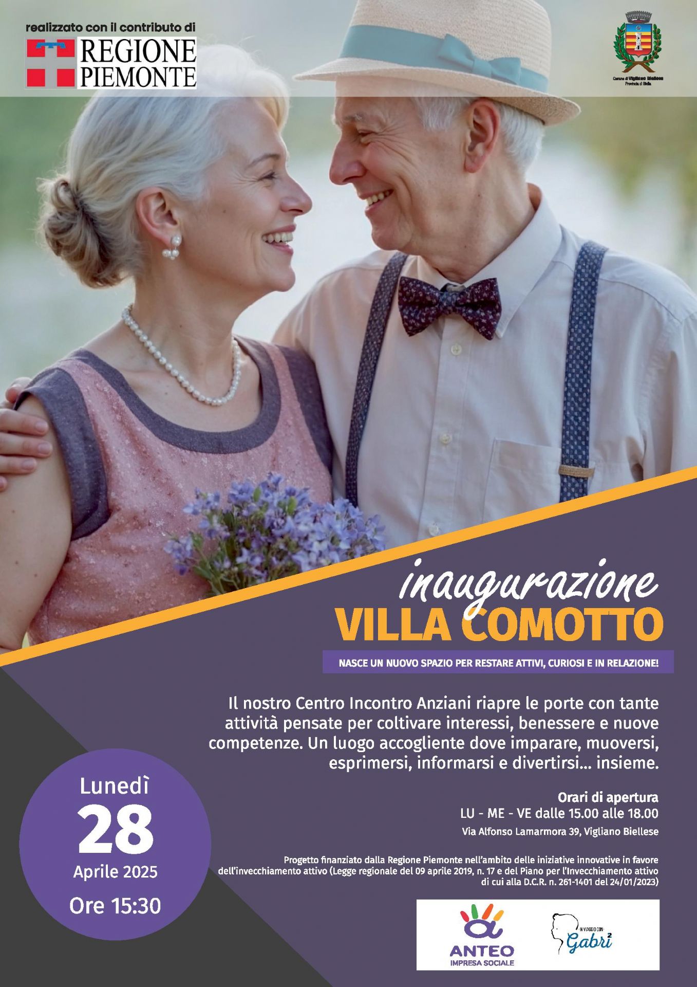 Lavorare nella direzione dell’invecchiamento attivo significa mettere a frutto tutte le possibili opportunità di salute, partecipazione, sicurezza per le persone anziane. E’ con questa finalità che il Comune di Vigliano Biellese sta realizzando il progetto “Attivamente senior”, con il contributo della Regione Piemonte. La volontà di riaprire le porte del Centro Incontro Anziani ha preso forma, con molte novità pensate per coltivare interessi, benessere e nuove competenze. Un luogo accogliente dove imparare, muoversi, esprimersi, informarsi e divertirsi nello stesso tempo.